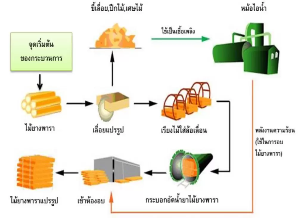 จากรูปกระบวนการแปรรูปไม้ยางพารา จะมีขั้นตอนการผลิต ตามรูปที่1