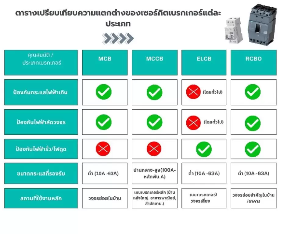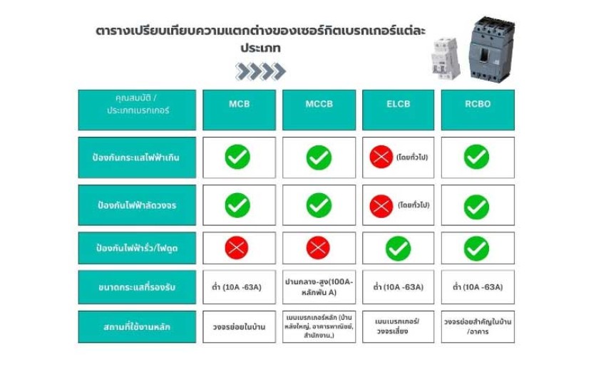 เพื่อให้เห็นภาพรวมชัดเจน เรามาสรุปความแตกต่างของเซอร์กิตเบรกเกอร์แต่ละประเภทในตารางง่าย ๆ กันค่ะ