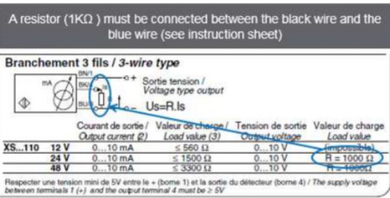 สมมติถ้าเรามี Inductive Sensor Analog Output ที่ออก 0-10 mA แต่เราต้องการใช้เป็นแบบแรงดัน0-10 VDC จะสามารถทำได้หรือไม่ คำตอบนี้ขอยกตัวอย่างของรุ่น XS4P12AB110 ยี่ห้อ Schneider คือ สามารถทำได้ โดยการใช้ R ขนาด1000 Ohm ต่อคร่อมที่ขาสีดำและน้ำเงิน ดังรูป